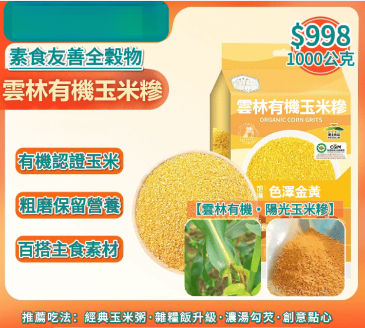 【雲林有機·陽光玉米糝】追求純粹無添加的穀物原味「有機玉米糝」以雲 林在地有機玉米磨製,金黃顆粒飽滿,熬粥煮飯皆宜,帶來陽光般的自然甘甜!